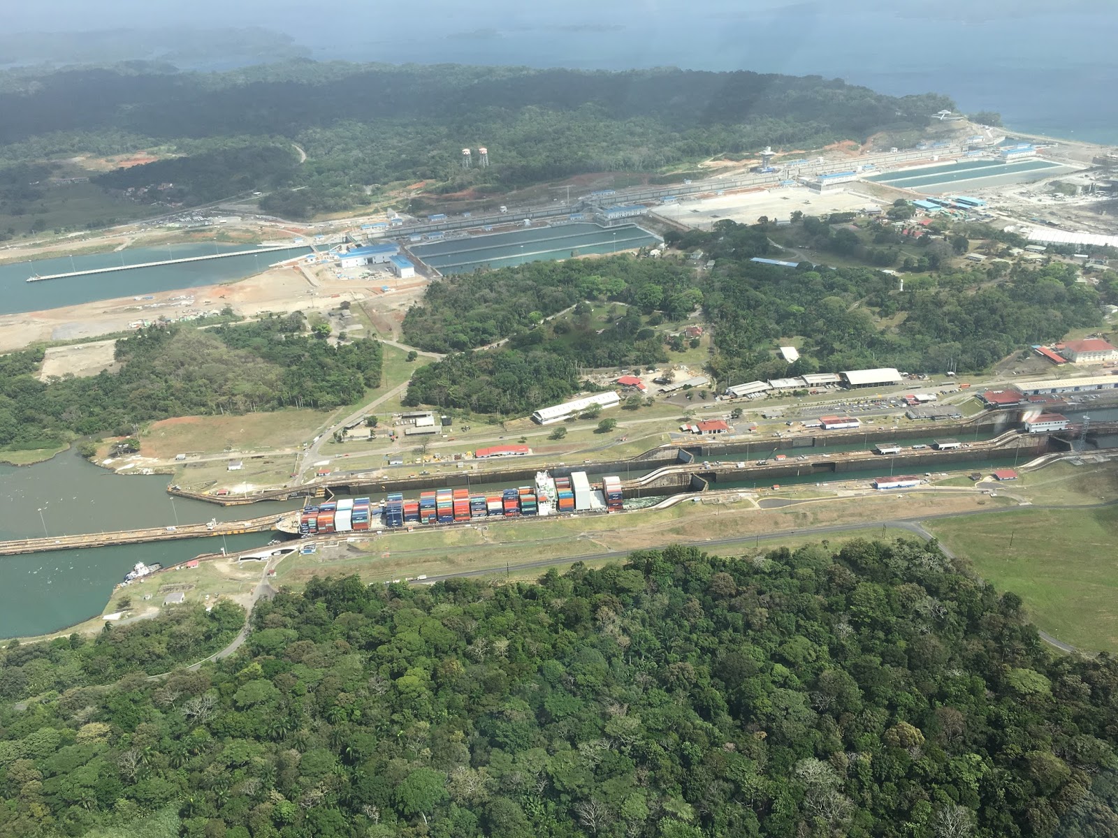 The canal itself is actually constructed using three natural lakes, which are connected by the locks to make up the full distance of the waterway. Between the locks, these lakes sprawl out with jungle alongside, and create a beautiful pattern as you fly over. Our flight was in the afternoon, so many of the ships for the day had already passed the locks, and the lakes were mostly empty.